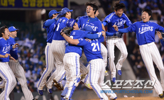삼성 선수들이 2012 팔도프로야구 한국시리즈 6차전에서 SK 와이번스를 7대0으로 눌러 우승을 확정짓고 환호하고 있다. 잠실=최문영 기자 deer@sportschosun.com /2012.11.01/