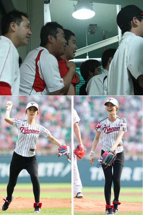 특히 LG트윈스 유니폼 상의에 타이트한 블랙 미니커트를 입고 그라운드 한 가득 자체발광 미모를 발산한 김태희의 모습에 선수들이 입을 벌린 채 넋을 놓고 바라보고 있어 웃음을 자아낸다.