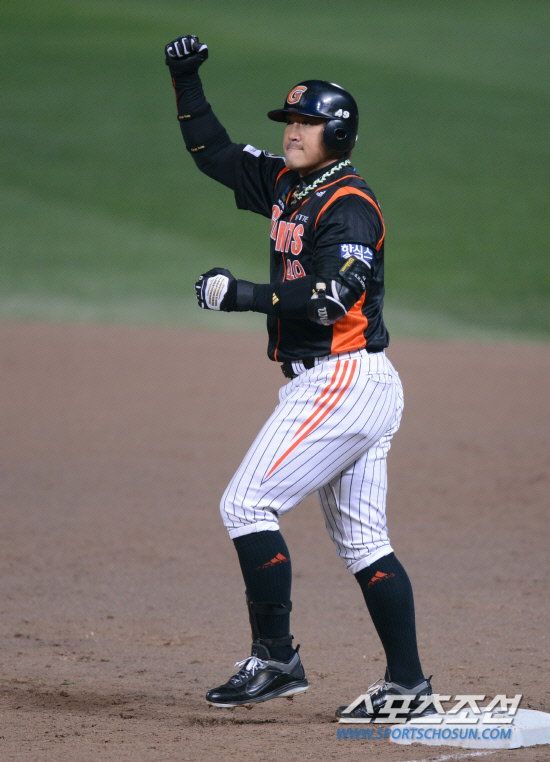 22일 오후 인천 문학구장에서 2012 프로야구 플레이오프 5차전 롯데와 SK의 경기가 열렸다. 2회초 2사 1,2루서 롯데 홍성흔이 1타점 적시타를 친 후 환호하고 있다. 인천= 김경민 기자 kyungmin@sportschosun.com / 2012.10.22.