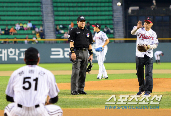 21일 잠실야구장에서 열린 프로야구 LG와 롯데의 경기에서 경기 전 LG 봉중근의 아버지 봉동식 씨가 시구를 했다. 봉중근이 포수를 보는 가운데 힘차게 볼을 던지고 있는 봉중근 아버지. 잠실=송정헌 기자 songs@sportschosun.com/2012.9.21 |