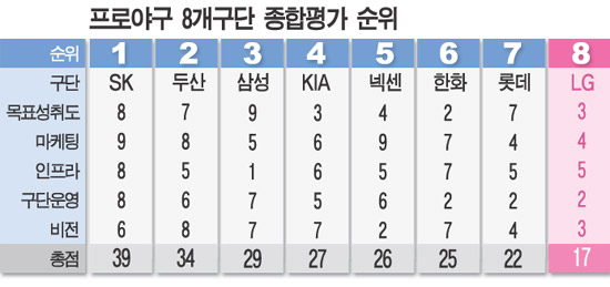 LG트윈스가 스포츠조선이 집계한 '프로야구단 종합평가'에서 최하위를 기록했다. 목표성취도와 마케팅, 인프라, 구단운영, 비전 모두 하위권에 머물렀다. 5개 부문(10점 만점)에서 1위 SK(39점)의 절반도 안되는 17점을 얻는 데 그쳤다. 도대체 왜 1990년대 명문구단 LG가 이토록 박한 평가를 받아야 했을까.