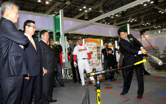 | SQ교실에 대한 설명을 들은 뒤 스윙을 해보고 있는 교육과학기술부 이주호 장관(오른쪽). SK제공 |