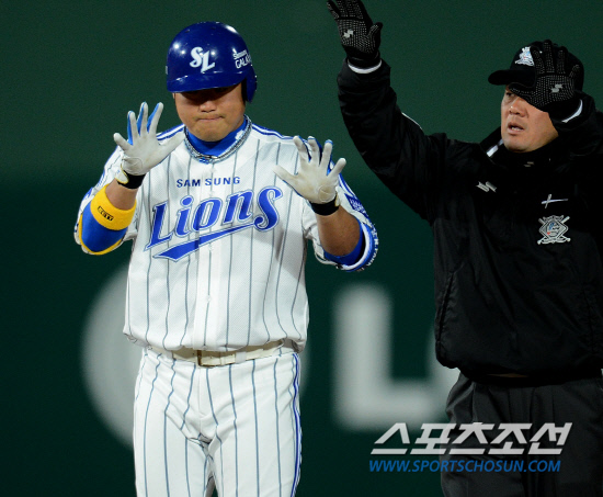 10일 부산구장에서 2012 아시아시리즈 삼성 라이온즈와 차이나 스타즈의 경기가 열렸다. 1회말 1사 1,2루 삼성 박석민이 2타점 2루타를 치고 타임을 요청하고 있다. 부산=정재근 기자 cjg@sportschosun.com