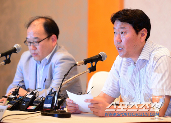 지난 7월 13일 선수협 박충식 사무총장이 올스타전 참가 결정을 알리는 장면. 선수협은 시즌이 끝난 뒤에도 10구단 창단을 차일피일 미루는 듯한 구단들의 행태에 골든글러브 시상식 보이콧 등 강경책을 내놨다. 스포츠조선DB