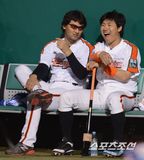 박찬호와 장성호가 나란히 앉아 얘기를 나누는 모습. 박찬호가 은퇴를 선언하고 장성호가 롯데로 트레이드돼 더이상 한화 유니폼을 입은 둘의 모습은 볼 수 없게 됐다. 스포츠조선DB