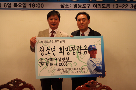 한국시리즈 2연패를 이끈 류중일 삼성 감독(49)이 최근 청소년들을 위한 장학금을 기부했다. 그는 (사)청소년선도위원회 중앙회 홍보이사를 맡고 있다.