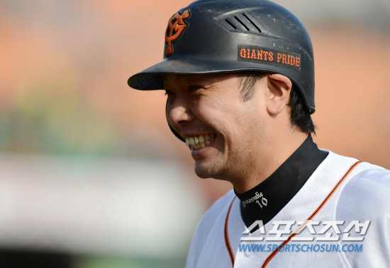 9일 부산구장에서 2012 아시아시리즈 요미우리 자이언츠와 퍼스 히트의 경기가 열렸다. 7회말 무사 1,3루 대타로 나온 요미우리 아베가 1타점 안타를 친 후 대주자와 교체되어 들어오며 활짝 웃고 있다. 부산=정재근 기자 cjg@sportschosun.com/2012.11.09/