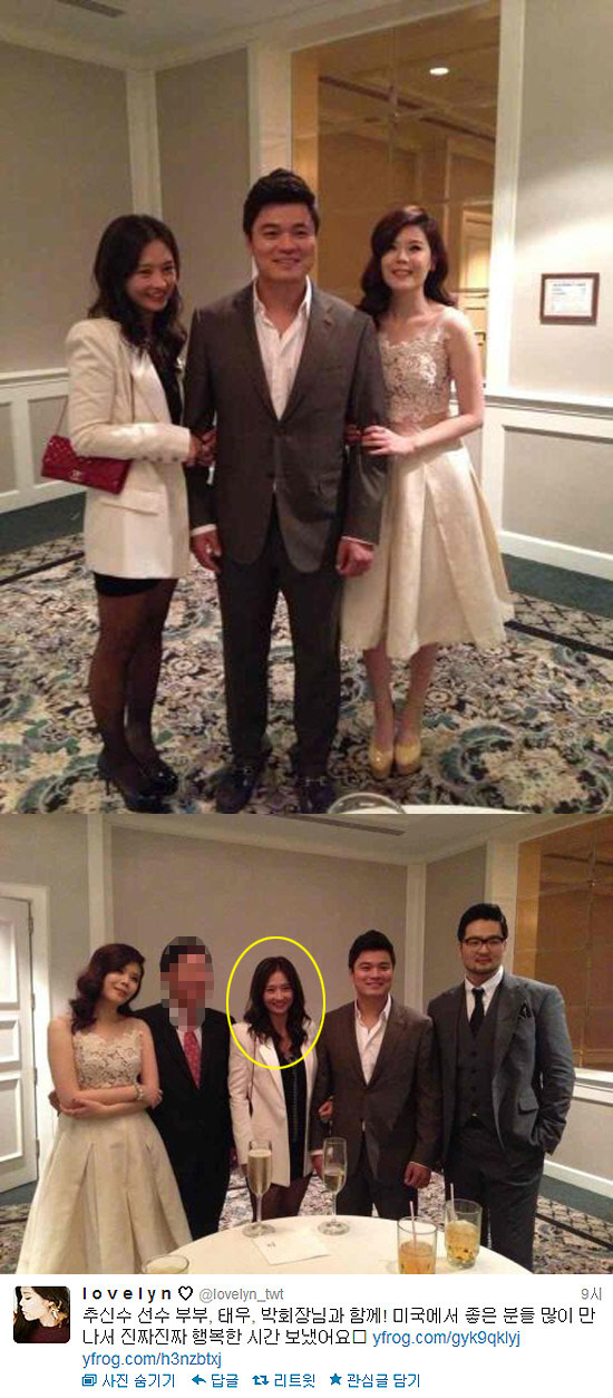 사진 속에는 추신수 부부와 가수 김태우, 린 등이 환한 표정을 지으며 다정한 모습으로 정면을 응시하고 있다. 특히 추신수의 아내 하원미 씨의 빼어난 미모가 눈길을 끌고 있다. 작은 얼굴과 늘씬한 몸매로 여느 연예인 못지않은 미모를 자랑했다.