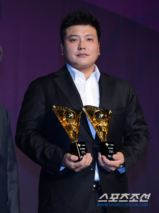 5일 오후 서울 삼성동 그랜드 인터컨티넨탈 호텔에서 2012 프로야구 최우수선수(MVP) / 최우수 신인선수 선정 및 부문별 시상식이 열렸다. 수위타자상, 최고출루율상을 받은 한화 김태균이 구본능 KBO 총재에게서 트로피를 받아들고 있다. 김경민 기자 kyungmin@sportschosun.com /2012.11.05. |