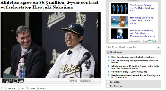 올해초 포스팅시스템(비공개 경쟁입찰)을 통해 미국행을 타진하다가 좌절한 일본 프로야구 나카지마 히로유키(30)가 메이저리그 오클랜드에 입단했다.