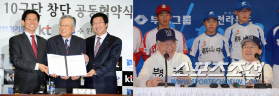 | 10구단 창단을 선언한 KT(왼쪽)와 부영의 창단 기자회견 모습. 스포츠조선DB |