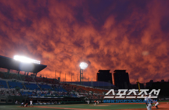 | 2012 프로야구 넥센과 한화의 경기가 열린 9월 16일 목동 야구장의 하늘에 오렌지색 구름이 가득 채워 가을밤의 정취를 더하고 있다. 목동=최문영 기자 deer@sportschosun.com /2012.09.16/ |