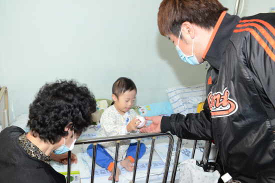 롯데 자이언츠 선수단이 4일 부산 고신대 복음병원을 찾아 소아암 어린이 돕기 행사를 실시했다.
