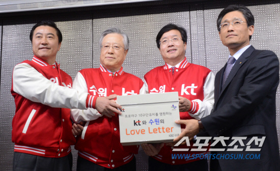 눈에 띈 건 빨간색 야구점퍼. '수원 KT'가 적혀있는 야구점퍼를 모두 입고 나와 통일된 느낌을 줬다. '프로야구 10구단 유치를 염원하는 KT와 수원의 러브레터'라는 이름의 신청서 박스를 양 총장에게 직접 전달했다.