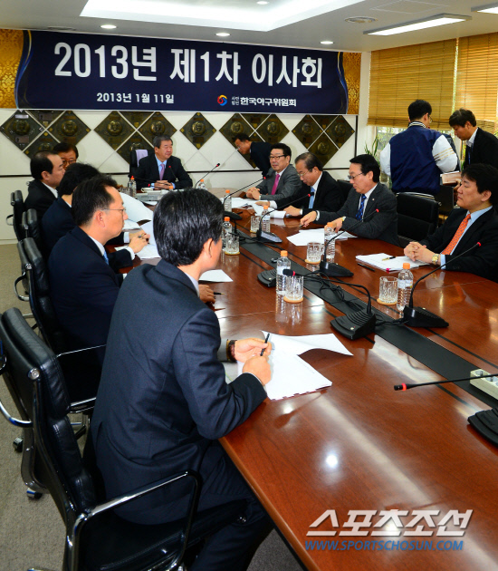 프로야구 제10구단 창단 구단을 사실상 결정할 이사회가 11일 서울 도곡동 야구회관에서 열렸다. 구본능 총재와 각 구단 사장단이 이사회 자료를 검토하고 있다. 창단 유치 신청을 한 KT와 수원, 부영과 전북이 지난 10일 평가위원들을 상대로 프레젠테이션을 가졌고 이사회에서 평가위원회의 결과를 본 뒤 10구단을 정한다. 허상욱 기자 wook@sportschosun.com/2013.01.11/
