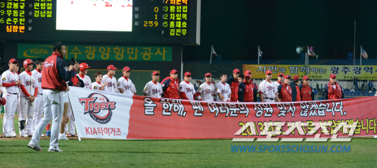 6일 광주구장에서 2012 프로야구 삼성과 KIA의 시즌 마지막 경기가 열렸다. 3-4로 패하며 경기를 마친 KIA 선수들이 그라운드로 나와 팬들을 향해 인사하고 있다. 광주=정재근 기자 cjg@sportschosun.com/2012.10.06/ |