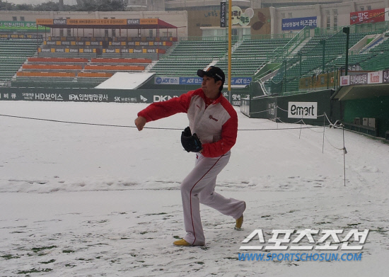 눈이 쌓인 그라운드에서 SK 윤희상과 문승원이 캐치볼을 하고 있었다. 윤희상은 "원래 어제 캐치볼을 하는 날인데 WBC 출정식을 가느라 훈련을 못해서 오늘 했다"고 했다. 추운 곳에서 훈련하는 것보다 따뜻한 곳에서 하는 것이 훨씬 낫지 않을까. 윤희상은 당초 재활조에 속해 지난 3일 미국 애리조나에 가기로 돼 있었다. 몸이 아픈 것이 아니라 지난해 풀타임을 뛰어 좀 더 몸을 잘 만들라는 구단의 조치였다. 그러나 윤희상 스스로 가지 않겠다고 했다. "몸에 별로 이상이 없어 한국에서 훈련해도 충분하다고 생각했다"는게 윤희상의 변. 눈오는 날에 캐치볼을 하는 것에도 별 신경을 쓰지 않았다.