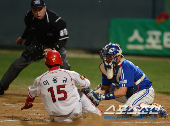 프로야구 삼성과 KIA의 경기가 20일 광주 무등야구장에서 펼쳐졌다. 3회말 1사 2루 김원섭의 안타때 2루주자 이용규가 홈에서 이지영에게 태그아웃 당하고 있다. 광주=전준엽 기자 noodle@sportschosun.com/2012.09.20/