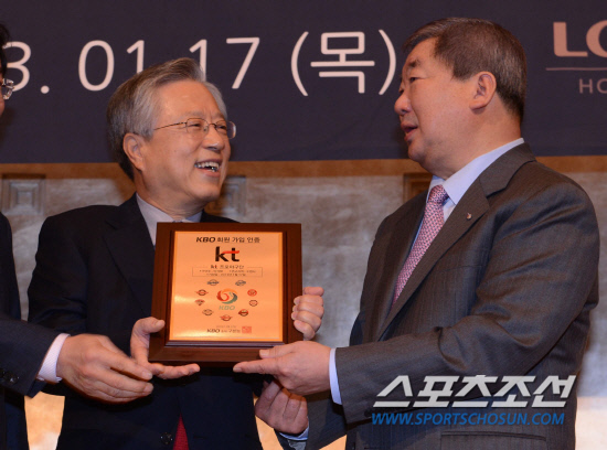 17일 오전 서울 소공동 롯데호텔에서 2013년도 KBO 정기총회가 열렸다. 2008년 이후 5년 만에 열린 이번 정기총회에서 KT의 10구단 신규회원가입이 결정되었다. 정기총회 후 이석채 KT 회장이 KBO 구본능 총재에게서 회원가입 인증패를 받아들고 있다. 김경민 기자 kyungmin@sportschosun.com / 2013.01.17.