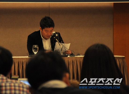 박재홍이 25일 은퇴 기자회견에서 자신이 준비한 은퇴 회견문을 읽고 있다. 권인하 기자 indyk@sportschosun.com