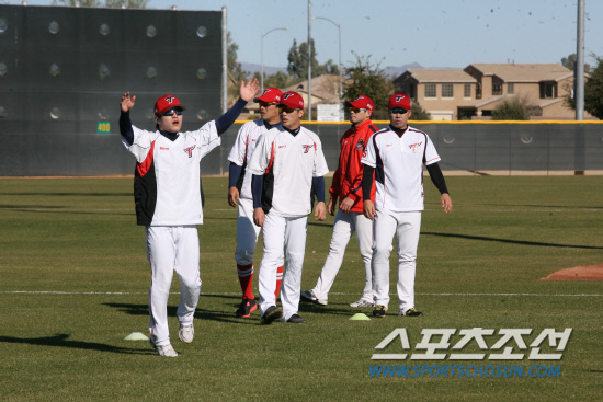 ◇미국 애리조나주 서프라이즈에서 진행되고 있는 KIA의 스프링캠프에서 김선빈과 김상현 김주찬 서재응 이범호(왼쪽부터) 등이 스트레칭을 하고 있다. 사진제공=KIA 타이거즈.