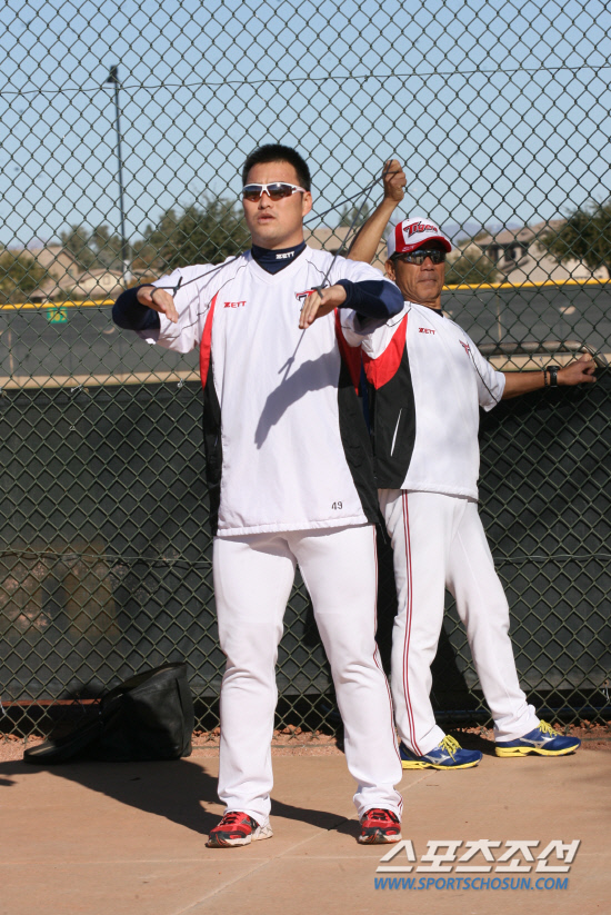 때문에 김진우는 지난 9일 일찌감치 따뜻한 애리조나에서 몸을 만들어왔다. 현재 재활은 상당히 호전된 상태인 것으로 전해졌다. 그러나 6년 만에 한 시즌 100이닝 이상을 던진 후유증은 가볍게 생각할 수 없다. 그러다보니 재활에 더욱 신중을 기하고 있는 것이다. 롱토스를 하면서 서서히 몸을 만들어나가는 중이다.
