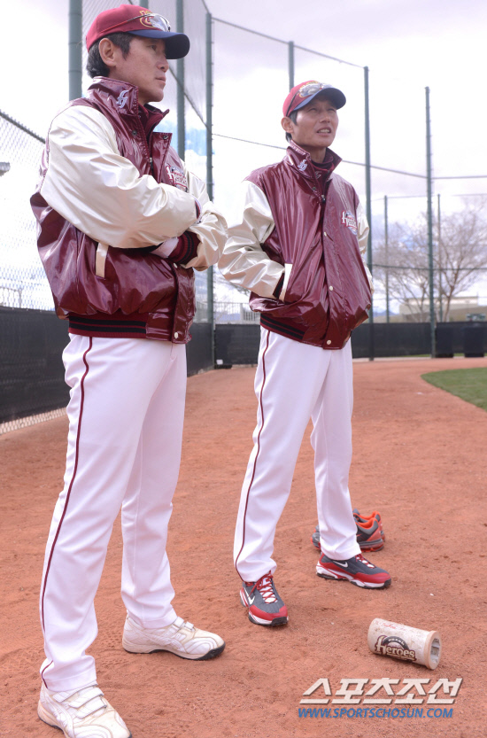 프로야구 넥센 히어로즈 선수들이 미국 애리조나 서프라이즈에 위치한 텍사스 레인저스 볼파크에 차려진 전지훈련장에서 2013년을 대비한 힘찬 담금질을 하고 있다. 히어로즈 이강철 수석코치와 염경엽 감독이 10일 오전(한국시간)선수들의 타격훈련을 지켜보고 있다. 서프라이즈(애리조나)=최문영 기자 deer@sportschosun.com /2013.02.10/