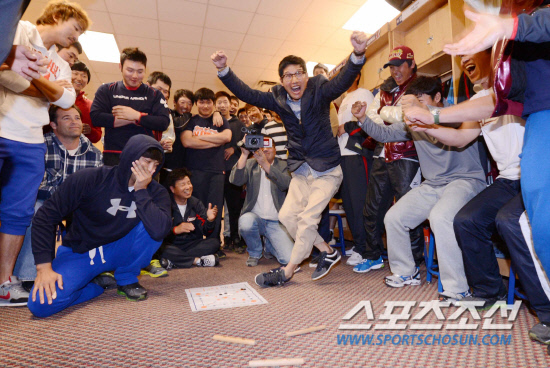 프로야구 넥센 히어로즈 선수들이 미국 애리조나 서프라이즈에 위치한 텍사스레인저스 볼파크에 차려진 전지훈련장에서 2013년을 대비한 힘찬 담금질을 하고 있다. 설날을 맞아 10일 오전(한국시간) 펼쳐진 락커룸 윷놀이에서 투수팀을 꺾고 결승전에 진출한 염경엽 감독과 코치진이 환호하고 있다. 서프라이즈(애리조나)=최문영 기자 deer@sportschosun.com /2013.02.10/