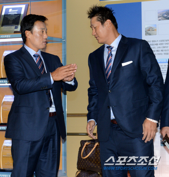 | 2013 월드베이스볼클래식 한국 대표팀이 전지훈련지이자 본선 1라운드 결전지인 대만으로 출국했다. 출국 전 이승엽과 이대호가 이야기를 나누고 있다. 인천공항=허상욱 기자 wook@sportschosun.com |