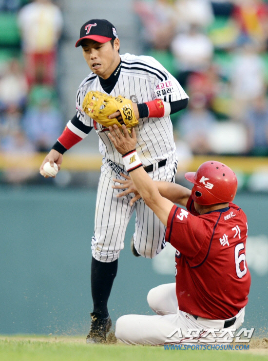 전날 연장 혈투를 벌인 LG와 KIA가 9일 잠실 야구장에서 다시 만났다. KIA 5회초 무사 1루 안치홍의 내야 땅볼때 1루주자 박기남이 병살 플레이를 막기위해 LG 2루수 김태완의 송구를 방해하고 있다. 잠실=조병관기자 rainmaker@sportschosun.com/2012.09.09/ |