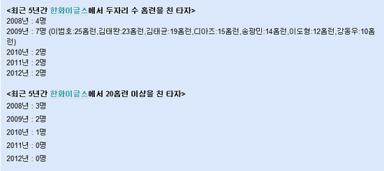 위에서 보듯이 한화이글스의 '다이너마이트 타선'은 2009년 9명의 라인업 중 무려 7명이 두자리수 홈런을 쳤던 것을 정점으로 매년 홈런타자들이 줄어들며 붕괴되었음을 알 수 있다. (최근 최근 5년간 한화이글스에서 30홈런 이상 타자로 범위를 좁히면 2010년 최진행의 32홈런 이후 한명도 배출하지 못하고 있다.)
