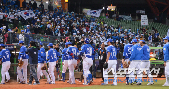 대표팀 소속으로 국제대회에 참가하면 가족과의 통화 내용도 경기 결과에 따라 달라진다고 한다. 4일 호주전 승리후 대표팀 선수들이 하이파이브를 나누고 있다. 타이중(대만)= 김경민 기자 kyungmin@sportschosun.com