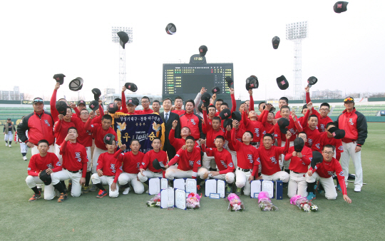 | 경상중 선수들이 제14회 삼성기 대구-경북지역 초-중학교 야구대회에서 우승한 뒤 환호하고 있다. 사진제공=삼성 라이온즈 |