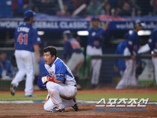 5일 오후 대만 타이중 인터컨티넨털 구장에서 2013 월드베이스볼클래식 1R 대만과 한국의 경기가 열렸다. 5회말 2사 1루서 1루주자 정근우가 이대호의 우중간 안타 때 홈까지 뛰어들었으나 아웃된 후 아쉬워하고 있다. 타이중(대만)= 김경민 기자 kyungmin@sportschosun.com