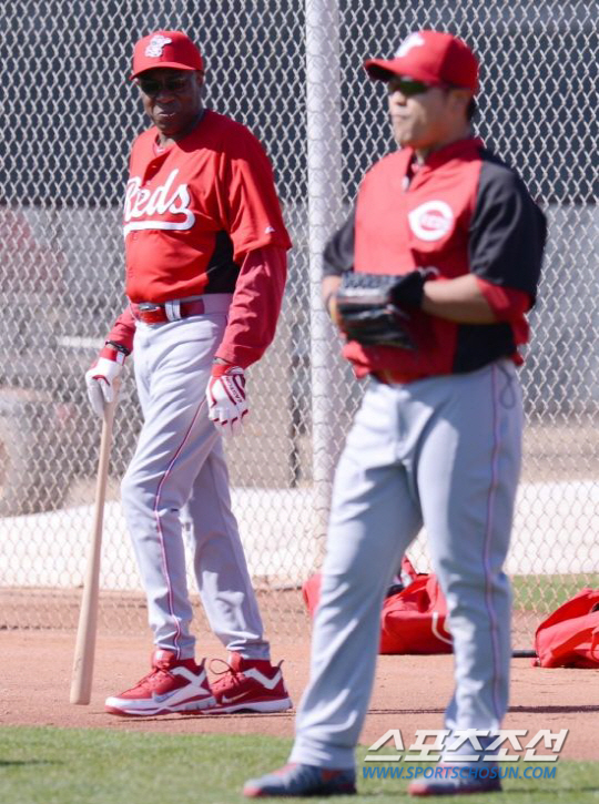 | 신시내티 더스티 베이커 감독이 새 멤버 추신수에 대해 친근감과 만족감을 드러냈다. 수비 훈련중인 추신수를 바라보며 지나가고 있는 베이커 감독. 최문영 기자 deer@sportschosun.com |