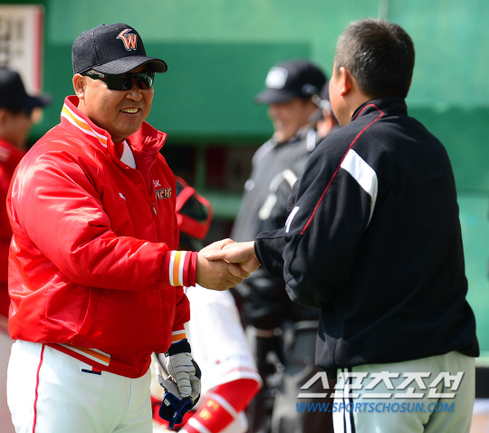 | 14일 인천구장에서 열리는 2013 프로야구 시범경기 LG와 SK의 경기를 앞두고 SK 이만수 감독과 LG 김기태 감독이 악수를 나누고 있다. 인천=정재근 기자 cjg@sportschosun.com/2013.03.14/ |