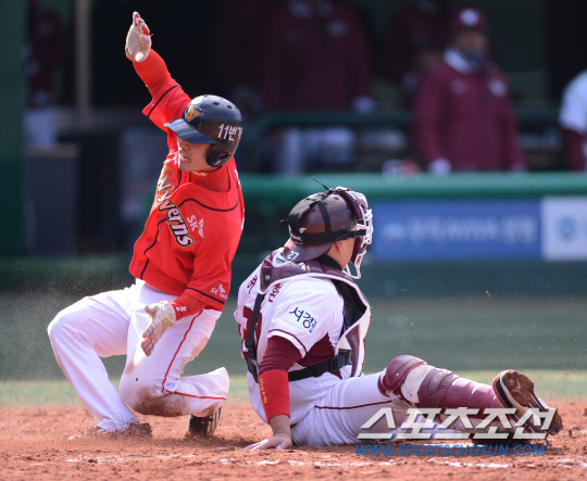 20일 오후 서울 목동야구장에서 2013 프로야구 시범경기 SK 와이번즈와 넥센 히어로즈의 경기가 열렸다. 8회초 2사 1,3루서 3루주자 김성현이 박승욱 타석 때 더블 스틸에 성공하고 있다. 목동=김경민 기자 kyungmin@sportschosun.com / 2013.03.20. |