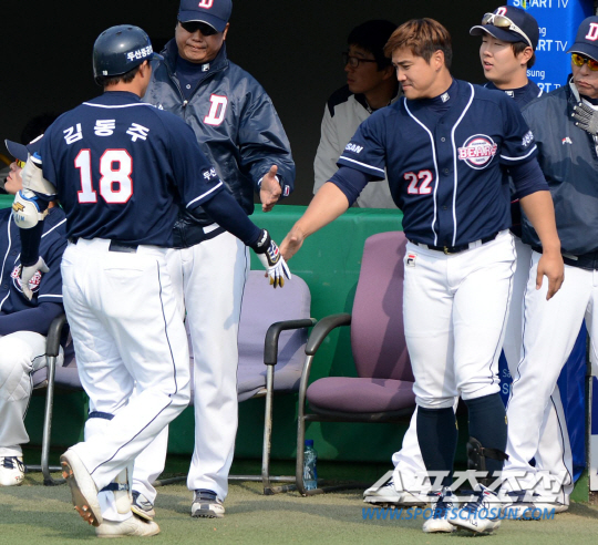 | 수비 포지션 변경을 시도하고 있는 김동주와 홍성흔. 지난 12일 대구 삼성과의 시범경기에서 격려하고 있는 김동주와 홍성흔. 허상욱 기자 wook@sportschosun.com |