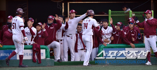 | 21일 오후 서울 목동야구장에서 2013 프로야구 시범경기 두산 베어스와 넥센 히어로즈의 경기가 열렸다. 6회말 2사 2,3루서 대타로 나선 이택근의 적시타 때 홈에 들어온 서건창과 장기영이 동료들과 하이파이브를 나누고 있다. 목동=김경민 기자 kyungmin@sportschosun.com |