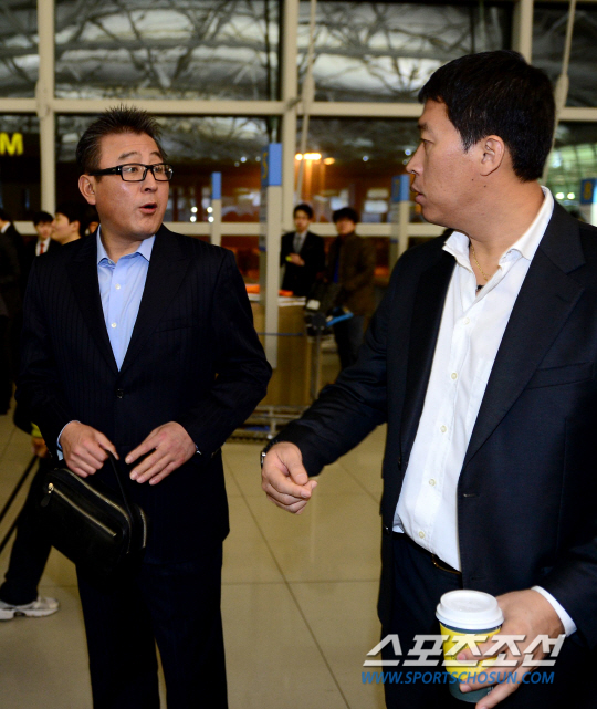 20일 오전 인천공항에서 LG트윈스 선수단이 전지훈련을 위해 사이판으로 출국했다. 출국장에서 김기태 감독이 이병규와 인사를 나누고 있다. 인천=송정헌 기자 songs@sportschosun.com