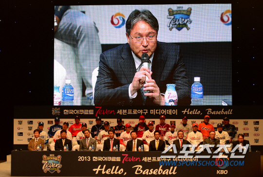 25일 서울 광진구 건국대학교 새천년관 대공연장에서 2013 프로야구 미디어데이가 열렸다. 9개구단 감독과 선수들이 모인 가운데 NC 김경문 감독이 포부를 밝히고 있다. 이날 행사에는 9개구단 감독과 신인선수, 대표선수들이 참석해 올 시즌 출사표와 각오, 포부 등을 발표했다. 또 미니 토크쇼 형식의 질의 응답 시간을 가지며 팬들의 궁금증을 풀어줬다. 정재근 기자 cjg@sportschosun.com/2013.03.25/ |