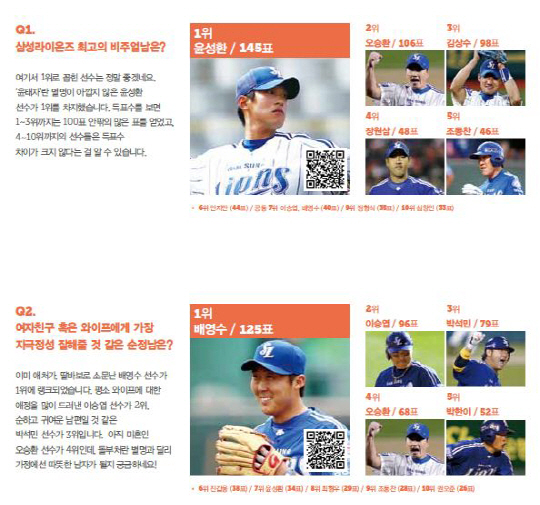 25일 발간된 삼성 라이온즈 2013시즌 팬북에서는 각 설문조사 항목의 1위에서 10위까지 선수들이 각각 몇 표씩 얻었는지 확인할 수 있다.