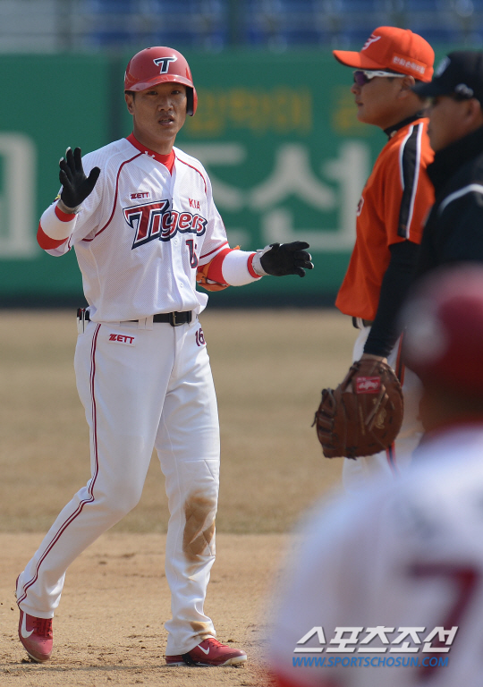 9일 광주구장에서 한화와 기아의 2013 프로야구 시범경기가 열렸다. 3회말 무사 2루 기아 김주찬이 좌익수 왼쪽 1타점 2루타를 치고 2루에 안착해 타임을 요청하고 있다. 김주찬은 1회에도 선두타자로 나와 3루타를 쳤다. 광주=정재근 기자 cjg@sportschosun.com/2013.03.09/ |