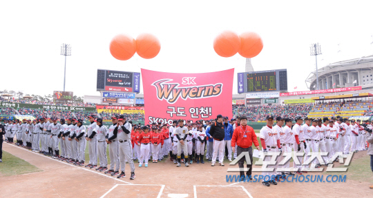 SK 와이번스가 30일 인천 문학구장에서 LG 트윈스와 2013프로야구 개막전을 펼쳤다. 경기전 양팀 선수들이 개막식 행사를 위해 그라운드에 도열하고 있다. 문학구장=최문영 기자 deer@sportschosun.com