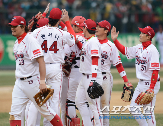 30일 광주구장에서 2013 프로야구 넥센과 KIA의 개막전이 열렸다. KIA가 10-9로 승리하며 개막전 8연패에서 탈출한 KIA 선수들이 하이파이브를 하고 있다. 광주=정재근 기자 cjg@sportschosun.com/2013.03.30/