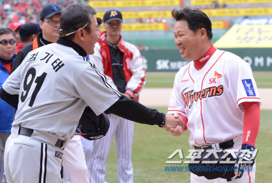 | SK 와이번스가 30일 인천 문학구장에서 LG 트윈스와 2013프로야구 개막전을 펼쳤다. 경기전 이만수 감독과 김기태 감독이 반갑게 인사를 나누고 있다.문학구장=최문영 기자 deer@sportschosun.com |