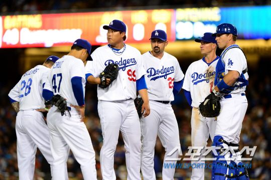 | 류현진이 7회 위기에 몰리자 다저스 내야수들이 모여 투수 교체를 지켜보고 있다. 류현진은 6⅓이닝 동안 10안타 3실점으로 잘 던진 뒤 7회 1사 2,3루서 마운드를 내려갔다. LA=송정헌 기자 songs@sportschosun.com |