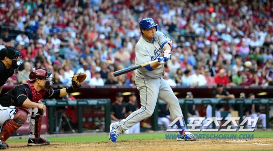 '코리안몬스터' 류현진이 메이저리그 2연승에 도전했다. LA다저스 류현진은 14일(한국시간) 미국 애리조나주 피닉스의 체이스필드에서 열린 애리조나 다이아몬드백스(D-백스)와 원정 경기에 선발로 출전 했다. 2회 타석에 선 류현진이 D-백스 이안 케네디 투수를 상대로 2루타를 날렸다. 힘차게 스윙하고 있는 류현진.