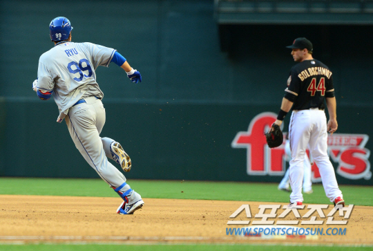 '코리안몬스터' 류현진이 메이저리그 2연승에 도전했다. LA다저스 류현진은 14일(한국시간) 미국 애리조나주 피닉스의 체이스필드에서 열린 애리조나 다이아몬드백스(D-백스)와 원정 경기에 선발로 출전 했다. 2회 타석에 선 류현진이 D-백스 이안 케네디 투수를 상대로 2루타를 날렸다. 베이스를 힘차게 돌고 있는 류현진.