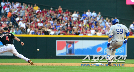 '코리안몬스터' 류현진이 메이저리그 2연승에 도전했다. LA다저스 류현진은 14일(한국시간) 미국 애리조나주 피닉스의 체이스필드에서 열린 애리조나 다이아몬드백스(D-백스)와 원정 경기에 선발로 출전 했다. 2회 타석에 선 류현진이 D-백스 이안 케네디 투수를 상대로 2루타를 날렸다. 베이스를 힘차게 돌며 2루에 안착하고 있는 류현진.